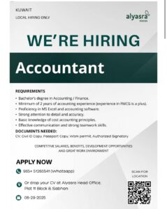 We are Hiring Accountant – alyasra 5 months ago by admin Accountant , Accounting Kuwait 28 viewsContact admin LocationKuwaitWhatsapp 51265541Company alyasraAdd to Favourites Report Abuse Report Abuse × Your Complaint *Related Listing Senior Accounting Supervisor 5 months ago Kuwait Accountant,Accounting Accounting Technician (Sales) 10 months ago Kuwait Accounting Accounting Technician (Poultry) 10 months ago Kuwait Accounting